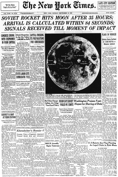 On September 12th, 1959, Soviet Rocket lands on Moon. On board were various scientific instruments intended for measuring the magnetic fields of the Earth and Moon.